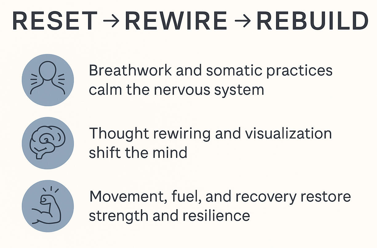 🌊 Movement: Training designed to rebuild strength, restore energy, and help your body support the demands of your mind — without pushing you deeper into burnout.